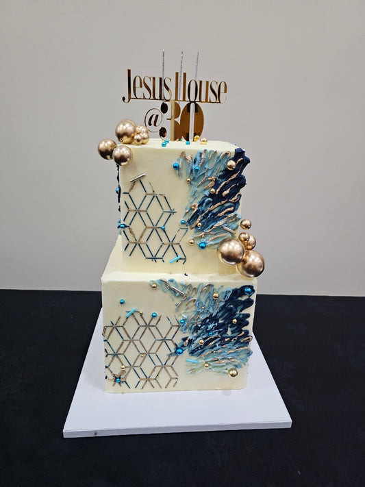 Blue square 2-tier buttercream cake with abstract design