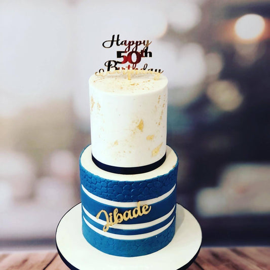 Blue, white & gold 50th birthday cake