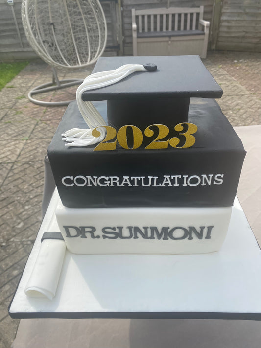 Graduation books and cap cake