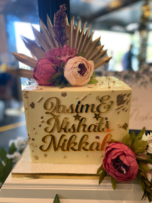 Square buttercream cake with name charm and flowers