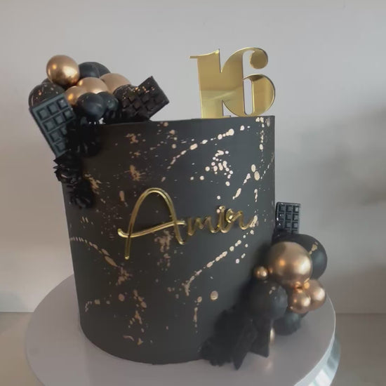 Make a bold statement with our Black and Gold Splash Cake, a show-stopping choice for elegant events. This luxurious cake features a sleek black finish accented with dramatic gold splashes, and optional metallic decorations. Perfect for milestone birthdays, anniversaries, graduations, or any luxury celebration, this cake combines sophisticated style with rich, indulgent flavor. Available in multiple sizes and customisable flavours, it's the perfect center piece for your next glamorous event.